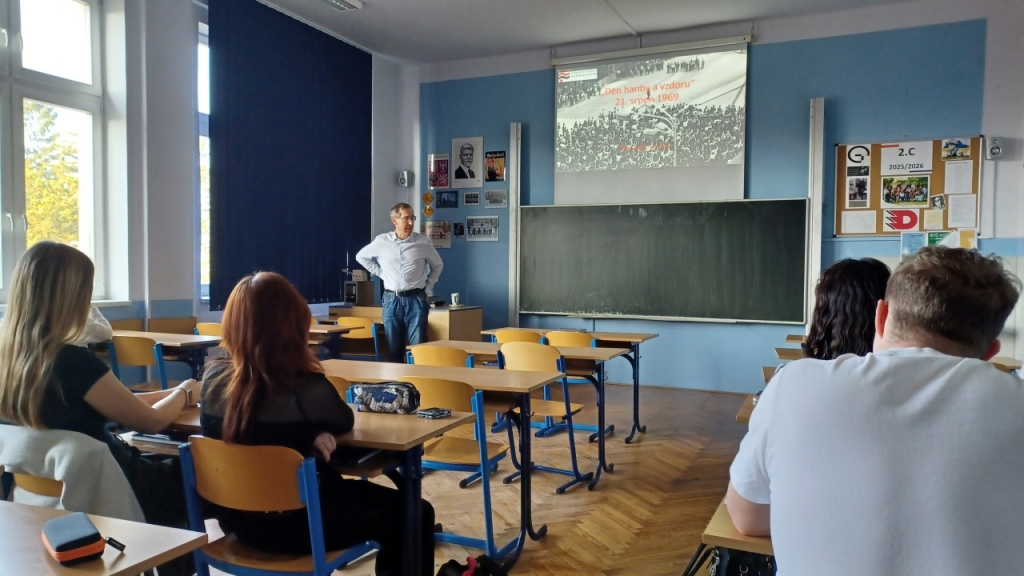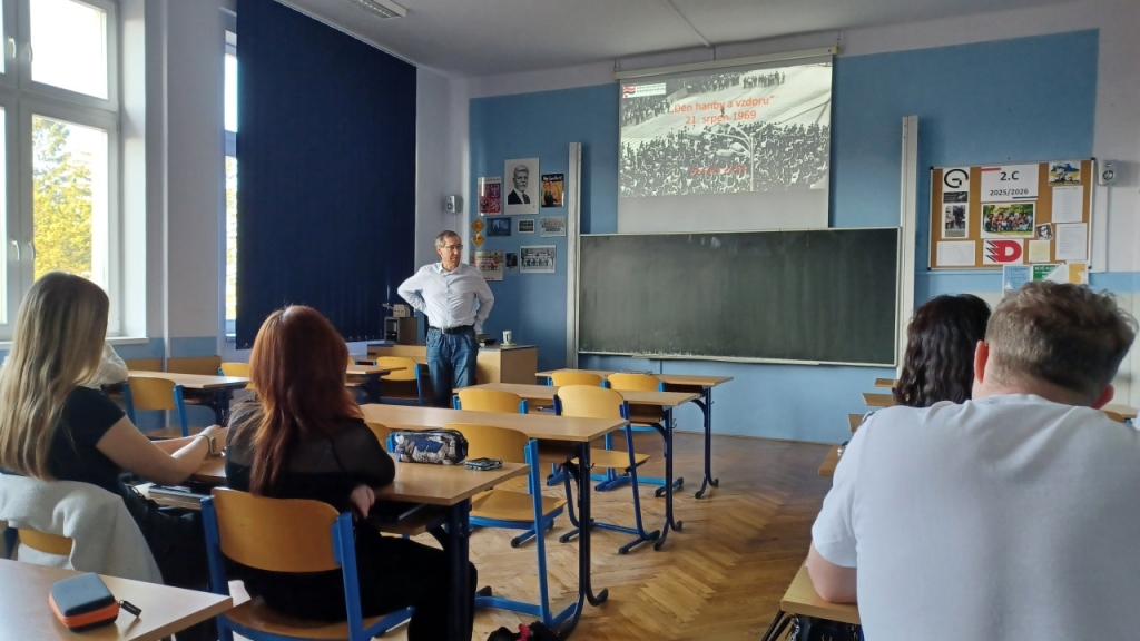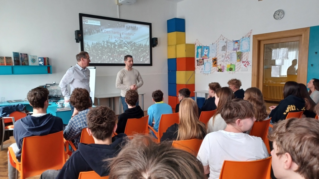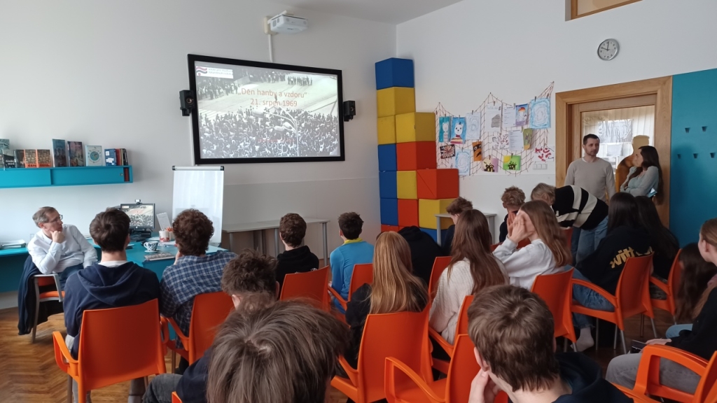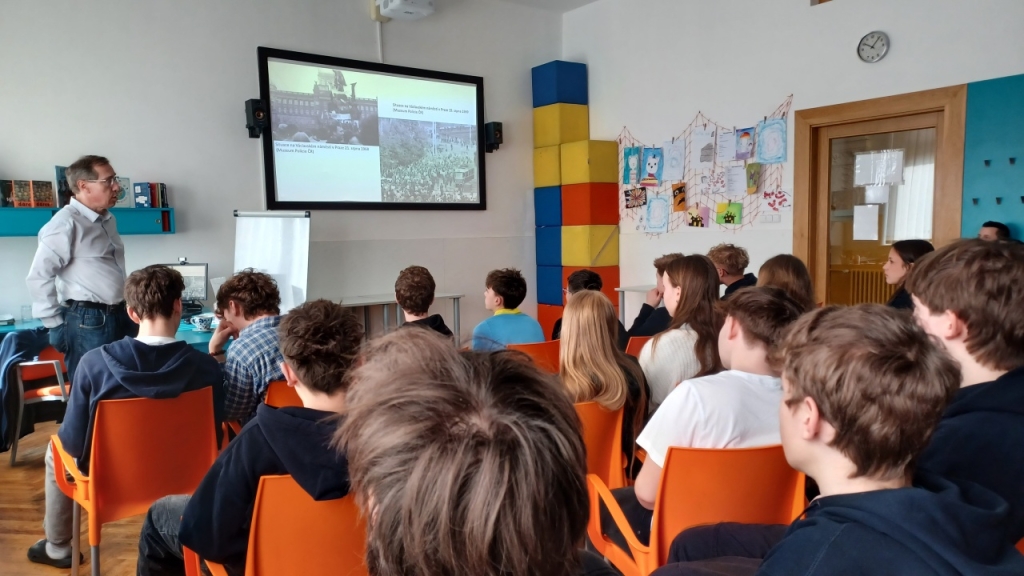 Přednáška pro studentky a studenty obou ročníků dějepisných seminářů se týkala prvního výročí okupace Československa vojsky Varšavské smlouvy, tedy 21. srpna 1969 v ulicích českých a moravských měst. Bohatý obrazový materiál doplnily unikátní záběry pořízené pracovníky StB, například z nedalekého Liberce a Prahy. Po závěrečné diskuzi, ve které studenti položili otázky tematicky blízké i vzdálenější, se Dr. Povolný přesunul na spřízněnou ZŠ Skálova, kde pro vybrané zájemce z řad devátých tříd přednášel na stejné téma.